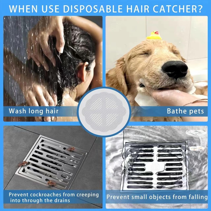 • This pack includes 50 disposable shower drain hair catchers, so you can keep your drain clog-free for weeks.