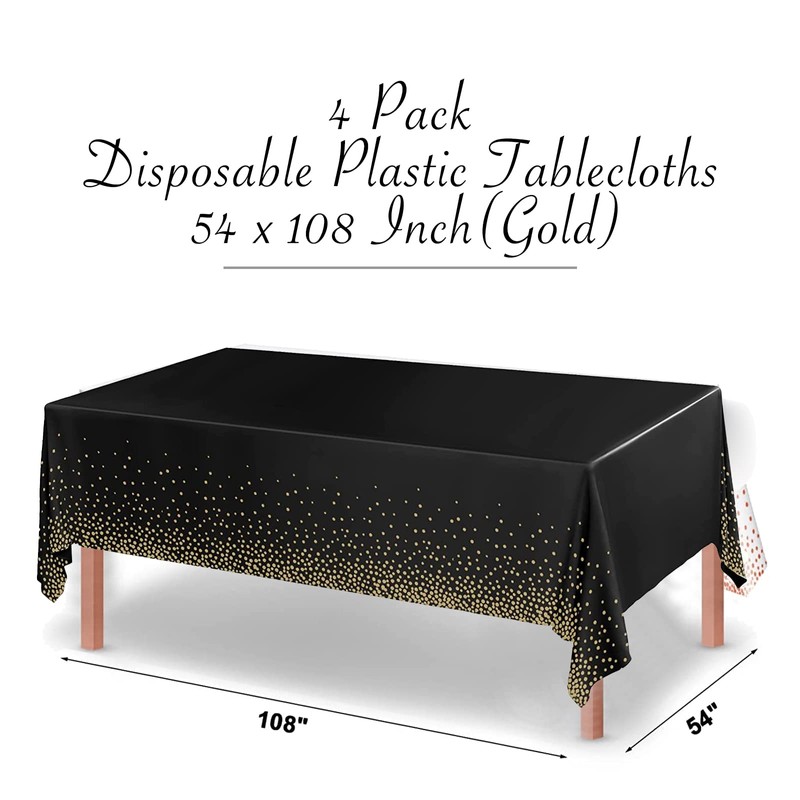 Disposable Plastic Tablecloths, 4 Pack Black and Gold Sequins Tablecloth 54" x 108" Party Table Cover Table Runner for Rectangle Tables up to 8 ft and Birthday Wedding Christmas New Year BBQ Banquet
