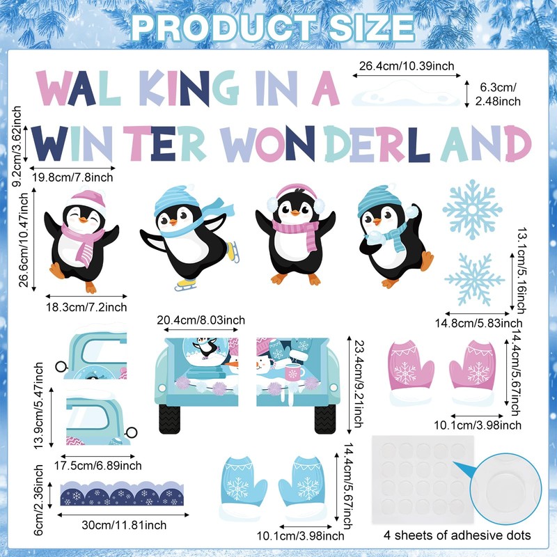 - Cute Design: our winter party decorations have a variety of styles, like snowflake cutouts, penguin cutouts, car cutouts, gloves cutouts, and English words cutouts, suitable for winter decorating classroom or home