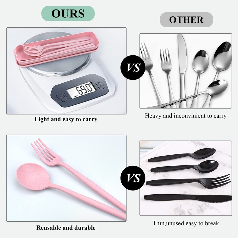 - Travel utensils with case: Reusable utensils set with case contains pink, eige, blue, green four colors cutlery set. Reusable fork and spoon set for lunch box can easily eat bread,pastries,salads,pasta,chicken,etc. Utensils are perfect alternatives to the black silver set, travel silverware, plastic cutlery set, disposable cutlery. Portable utensils set with case are perfect lunch box accessories for adult