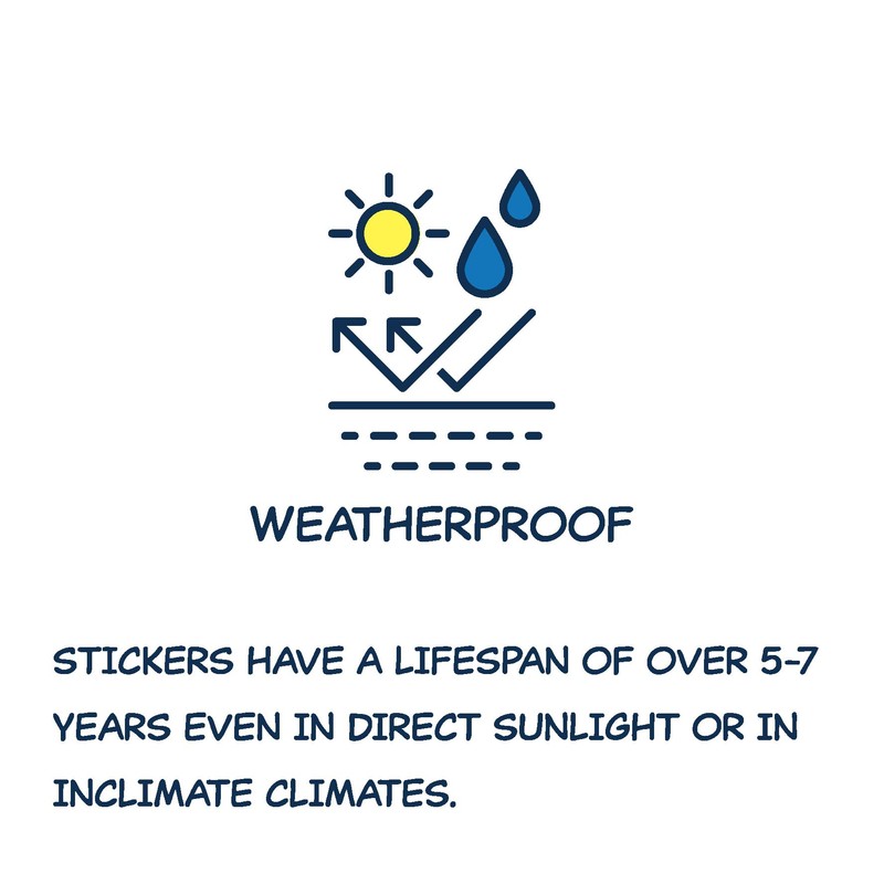 • Weatherproof - Stickers have a lifespan of over 5-7 years even in direct sunlight or inclimate climates.