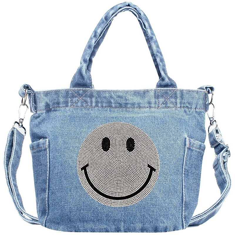 - Cute Smile Design Bag; Uses popular patches. A 2-way bag that will make you feel better just by holding it. It can be carried casually for adult use. This mini shoulder tote bag is made of natural denim material with a good texture. Convenient side pockets The opening is made with a zipper, so you don't have to worry about the contents falling off. There is also one inner pocket, so you can store your phone, cosmetics, etc. Simple and timeless design. Gusseted for ease of use