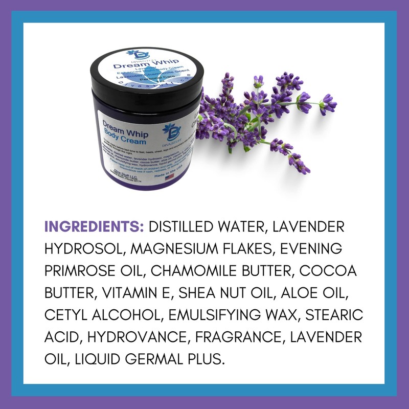 - MAGNESIUM: Dream Whip is a calming night body cream. This enhanced cream contains Magnesium and Hemp seed oil. The lavender scent from the essential oil is powerful and smells heavenly.