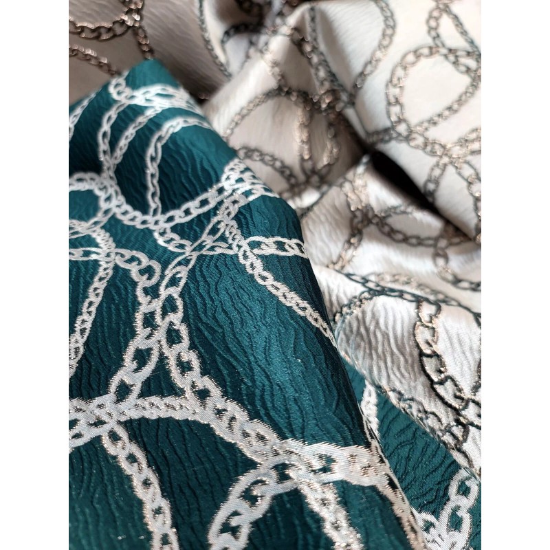 Add a touch of elegance to your next project with this stunning beige damask jacquard brocade fabric. The intricate chain pattern in shades of green and gold, enhanced by an embossed metallic chain circle, is perfect for apparel, accessories, and home decor. Made of high-quality polyester and measuring 60" in width, this medium-weight fabric is sold by the yard and is suitable for drapery, upholstery, hats, costumes, and more. Whether you're creating a dress for a special occasion or a pillow for your living room, this fabric from Divastyletextiles is sure to impress.