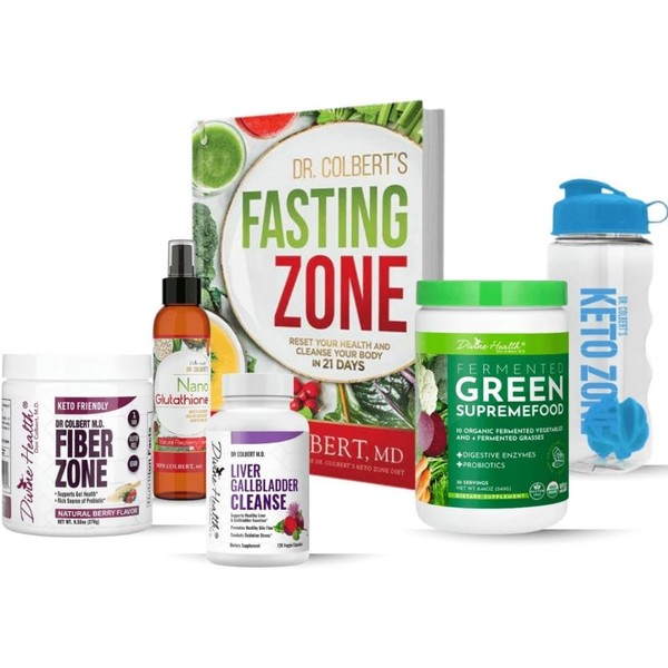 Divine Health Dr. Colbert MD Detox Starter Pack Green Supremefood | Fiber Zone (Berry) | Liver Gallbladder Cleanse | Nano Glutathione Spray | Fasting Zone Book | Shaker Bottle
