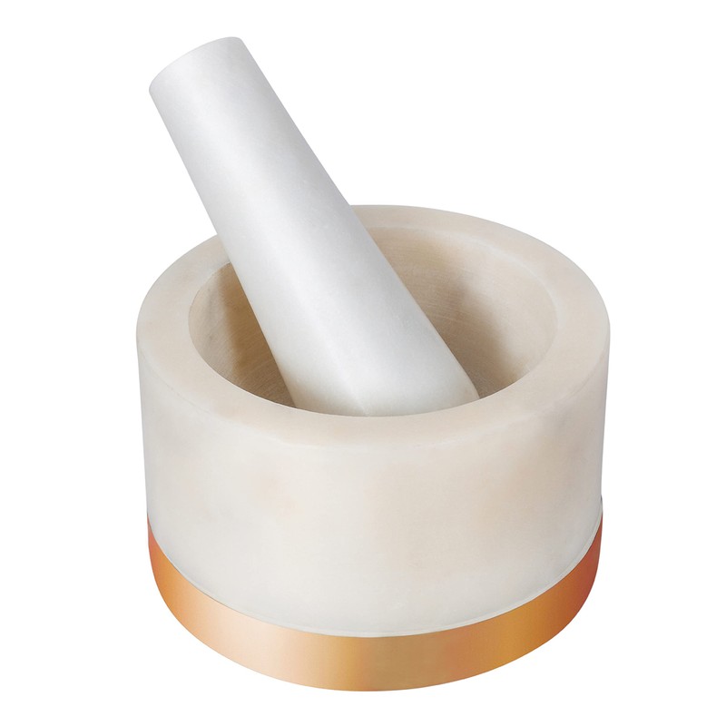 - MADE OF WHITE MARBLE: White marble adds an elegant look to your kitchen. The durable material serves you for years. The white marble Mortar & Pestle comes with a golden brass strip embedded to shine the unit. Hence it makes amazing kitchen décor items other than being a utility.
