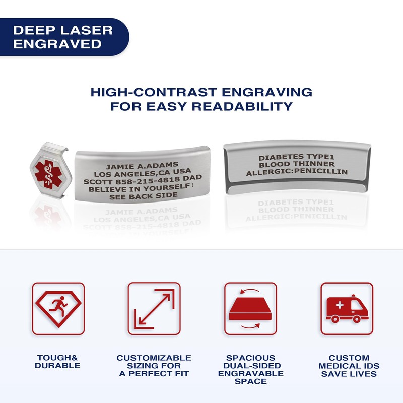 - 👍 Personalize your medical message with deep custom engraving on a spacious area, visible from the front and discreetly placed on the back. Laser-engraved for clarity, you can add up to 5 lines of 24 characters on the front and 4 lines of 24 characters on the back.