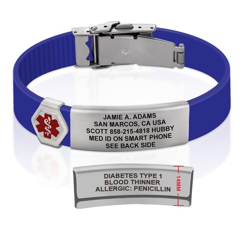 - Stay safe and stylish with our hypoallergenic stainless-steel medical alert bracelet. It features an adjustable food-grade silicone band for a perfect fit (sizes between 4.5 and 9.5 inches). Choose from two widths - PRO: 19mm or ULTRA: 13mm.