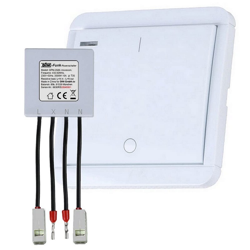 The DPM-3500 wireless power switch in modular design wirelessly switches all lamps and electrical devices and machines up to 3500 W on and off.