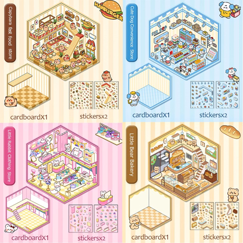 - Therapeutic 3D DIY Sticker Scenes for All Ages:Build charming Kawaii worlds with 4 reusable 3D house sticker sets! Create a Capybara Fast Food Shop, Bunny Boutique, Bear Bakery, or design your own dream scene. Perfect for stress relief therapy, family bonding, or sparking imagination. Includes tweezers for precision