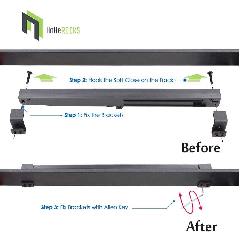 - 【Easy To Install】- With the soft close hooks and brackets included in the barn door soft close kit, just simply attach the soft close without drilling any holes on the barn door flat track. Also no need to consider the exact positon for applying the soft close with hooks, install the kit at anywhere on each side.