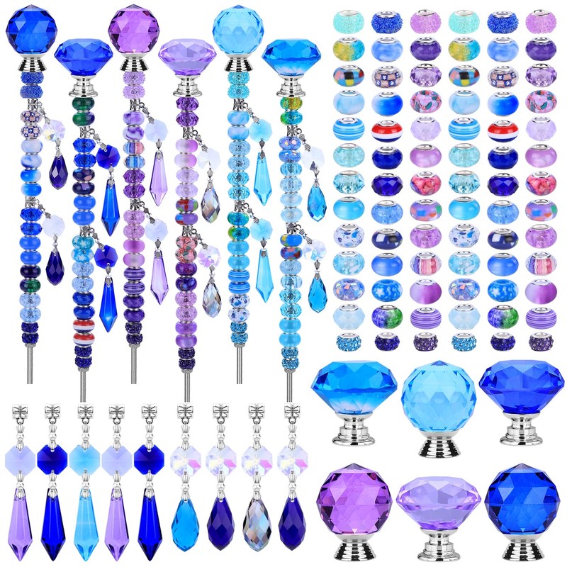 DIY Fairy Wand Garden Stakes Kit, Crystal Beaded Decorative Wands Set, Outdoor Garden Decoration with Assembly Guide (Purple+Aqua+Blue 208 Pcs)