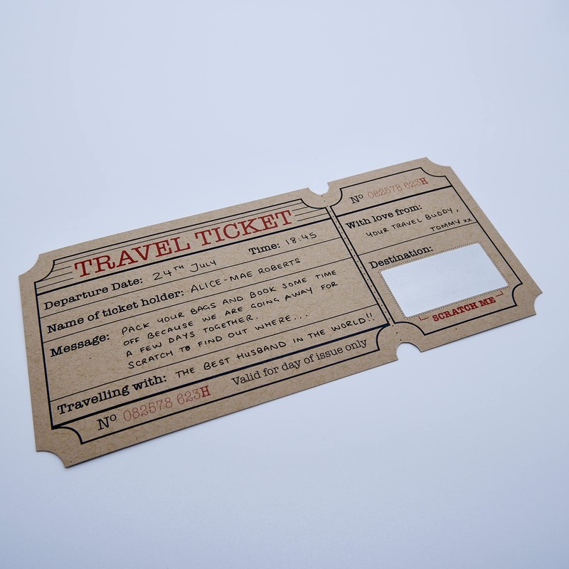 The ticket details are left blank for you to fill in and then hide the destination area with the provided scratch sticker (Easy-to-follow instructions are included). When your loved one scratches the sticker, their surprise destination will be revealed!