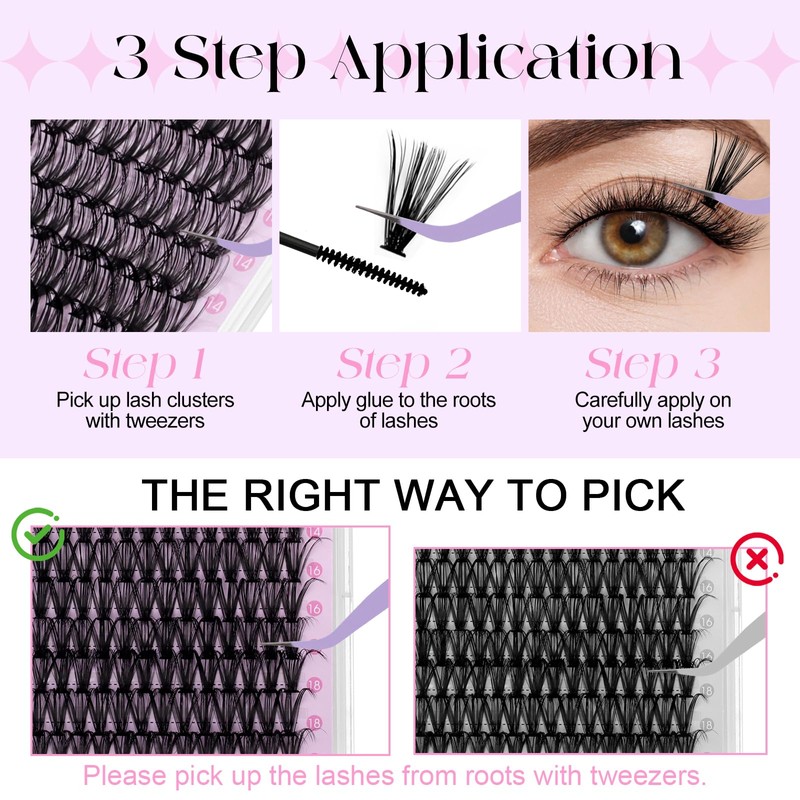 • Upgraded Technique, Reinforced Roots: Secondary reinforcement of the eyelash clusters roots prevents them from falling out or becoming deformed. Cluster lash extension are fluffy and curled, and will not fall out even when bathing or swimming.