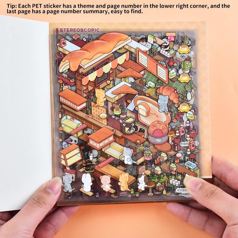 - DIY 3D House Scene Stickers: You will get a DIY 3D house scene sticker book and tweezers, containing 6 different sets of scenes, including Animal Sushi Restaurant, Panda Teahouse, Pet shop, Cat hotpot restaurant, bakery, Bar, more interesting and creative.