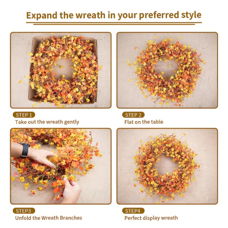 [Autumn wreath Size] The outer diameter of these fall wreaths for front door are about 22 inch, Because the package box is relatively small,so some arrangement is needed to achieve its original size