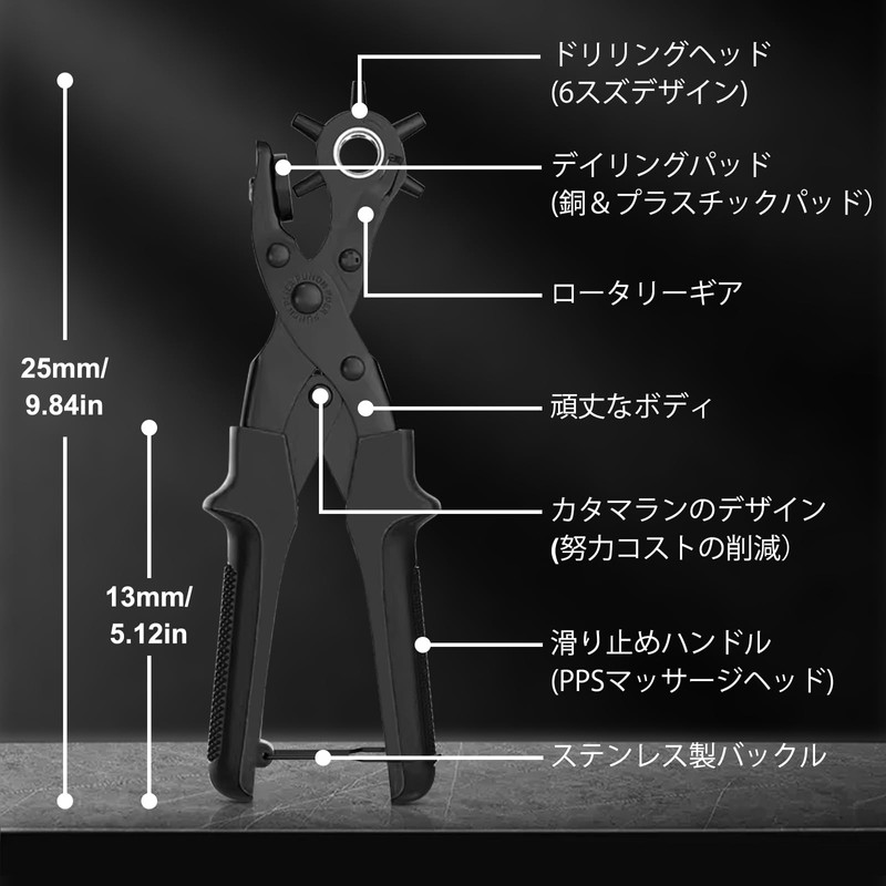 - [Size Mark & Multi-Function] Hole heads with 6 different rotatable sizes: 0.08, 0.1, 0.1, 0.1, 0.1, 0.1, 0.1, 0.1, 0.16, 0.16, 0.18, 0.Widely used to drill round holes in leather, belt, plastic, rubber, canvas, fabric, cardboard, saddles and similar materials, especially for leather. Choose the right size, rotate the wheels, align the belt position, and squeeze it out! Very easy