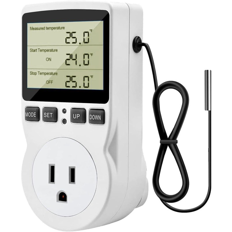 - 【Precise Digital Temperature Controller】Thermostat outlet: -40℃~120℃;plug in thermostat function with ±1% accuracy. Set the start and stop temperature to make the heater or cooler operate as programmed.