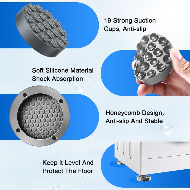 - Unique design: washing machine vibration damper. The washing machine has a groove design that makes it easier to assemble the equipment. The inner base features a honeycomb design to improve the ability of the rubber feet to fix the equipment, avoid shaking and avoid wear. Washing machine anti-vibration mat increases the total height of the device by 1.4 cm, ensures a smoother flow and extends the life of the washing machine.
