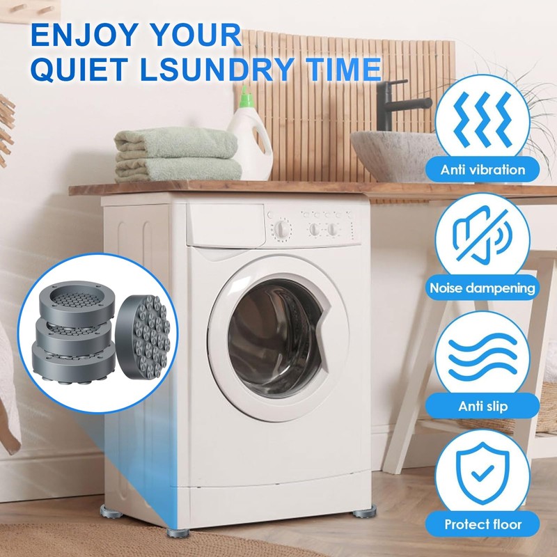 Washing machine pad dampens noise while maintaining vibration. These anti-vibration pads for washing machines act like stabilisers for your washing machine, reduce noise, are durable and provide a quieter washing experience.