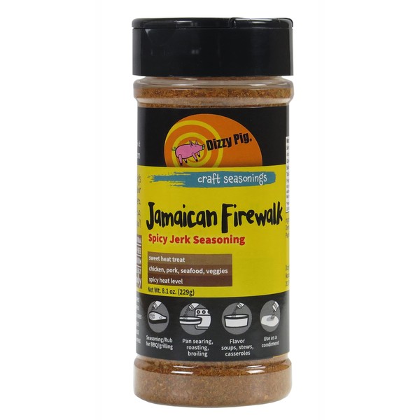 Dizzy Pig Jamaican Firewalk Spicy Jerk Seasoning Rub (8oz Shaker) - Seasons 30+lbs of Food - Hand Made in the USA - MSG Free, Gluten Free