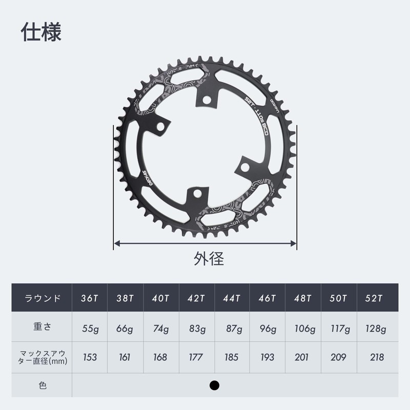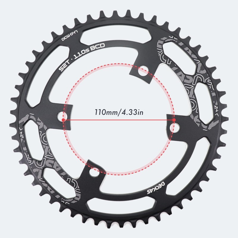 - 1 Year Warranty: We offer 1 year warranty. Package includes 1 unit of chainring. Weight: 36T(56g), 38T(66g), 40T(74g), 42T(83g), 44T(87g), 46T(96g), 48T(106g), 50T(117g), 52T(128g).