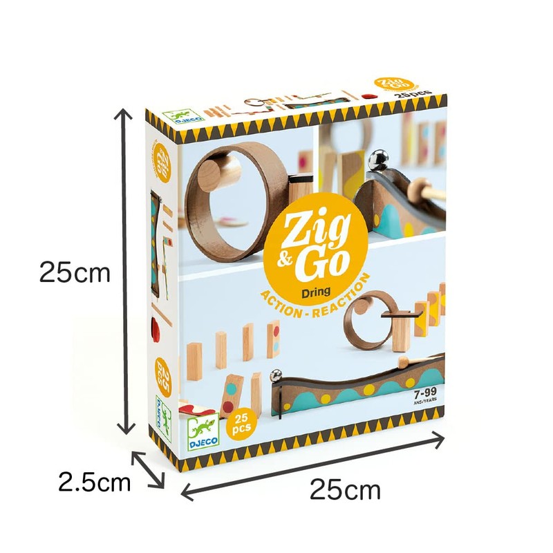 - (Zig&Go Domino Set) (Collect the series for double the fun! The Zig&Go (Jig and Go) from France DJECO, has 28 pieces, 27 pieces, and 25 pieces. You can freely mix and match them together, so you can collect unique parts to create large dominoes. You can also enjoy it as a Pythagora device