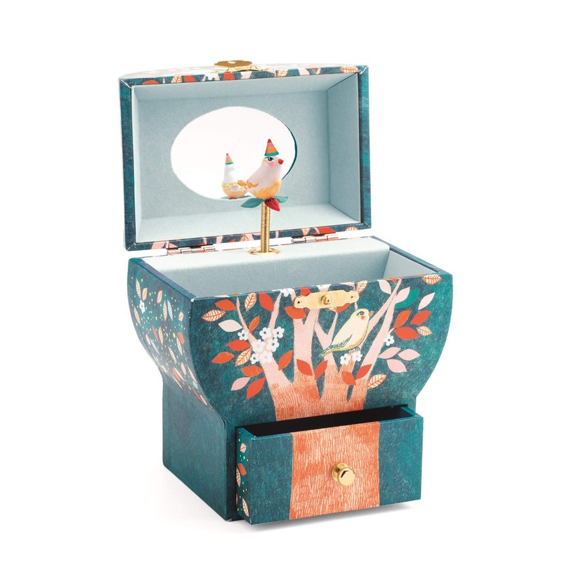 Everyone needs a place to keep their treasures, keepsakes and special stuff. These DJECO Treasure Boxes make a special gift and a wonderful dresser top decoration. Turn the handle on the back of the box and special, classic song plays. Each box has a special spinning figurine, mirror back drop, velevet lined compartments and a pull-out drawer. Beginning in France in 1954, DJECO creates award winning, timeless children’s products dedicated to quality, value and child development. With a philosophy of creativity, boldness and passion, our products are recognized as being as beautiful as they are entertaining. We believe that play is essential to a child’s intellectual growth; awakening curiosity, enriching boundless imagination and celebrating their inner brilliance. DJECO toys engage, energize and entertain. Originally focused on toys, games and puzzles, the they’ve expanded into crafts and home decor, sets designed with artistry, inspiration and a unique, hands-on aesthetic. Creating a place where kids can keep their hands in the paint, but their imaginations in the stars. We team with hundreds of internationally renowned artists who share our vison of promoting artistic discovery and freedom of imagination through play. Made from the highest quality materials with exacting and meticulous attention to detail, play value and artistry, DJECO products are revolutionizing the toy box. Engaging illustrations draw the child in, exceptional play enthralls, and the experience enhances a sense of wonder and delight. All DJECO products are child safe and completely non- toxic, meeting and exceeding all US and European testing standards.