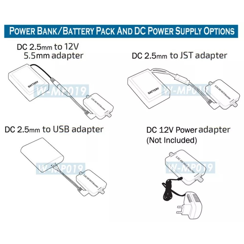 This Wi-Fi signal extender can be powered from wall outlet or powered through using a DC or JST battery pack or power bank.