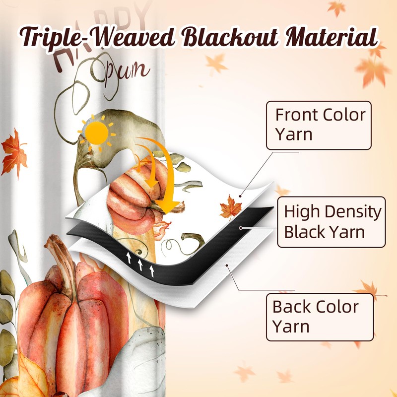 Thanksgiving Fall Leaves Pumpkin Blackout Window Curtain 2 Panel - 52" Width X 84 " Length with 6 grommets top each. 100% Polyester - Quality fabric polyester without lined feels soft and heavy.