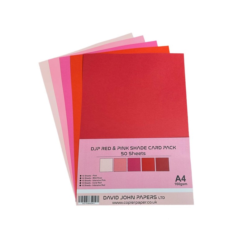 DJP 160GM Red & Pink Shade Tint Card Pack - 5 Colours, 50 Sheets - 10 Each Colour