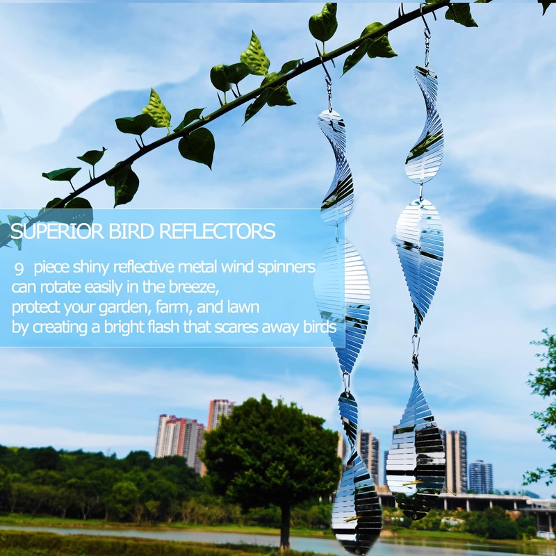 - These are 9 swivel hook and 9 fishbone shape bird scare of very shiny reflective matel wind spinners can rotate easily in the breeze.Individual fishbone wind spinners are 9.05inch in length, you can connect them as long as you need.protect your garden, farm, and lawn by creating a bright flash that scares away birds.