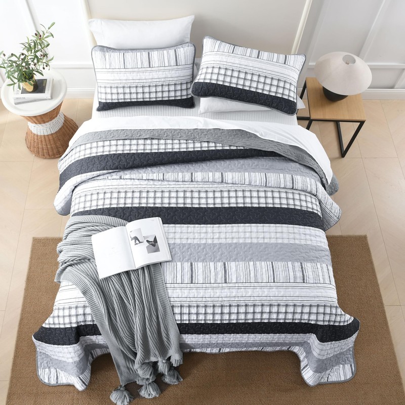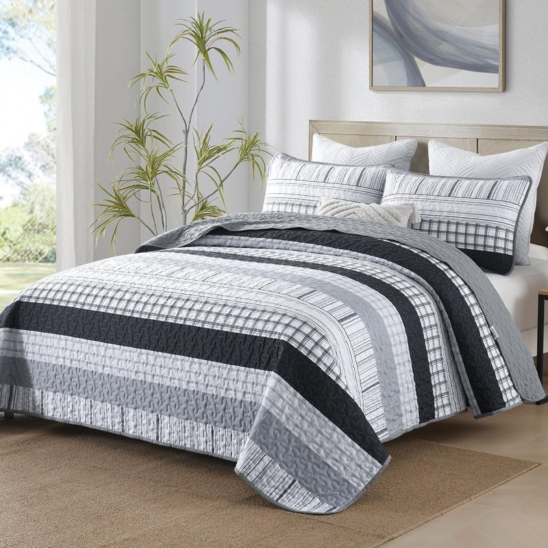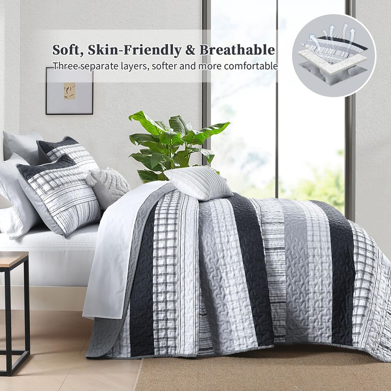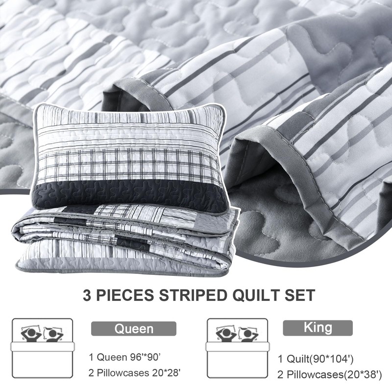 - 3 PIECE QUEEN QUILT SET: Our queen quilt set includes a black gray striped quilt (90 "x96") and two matching pillowcases (20 "x28") to add a sense of wholeness to your bedroom.
