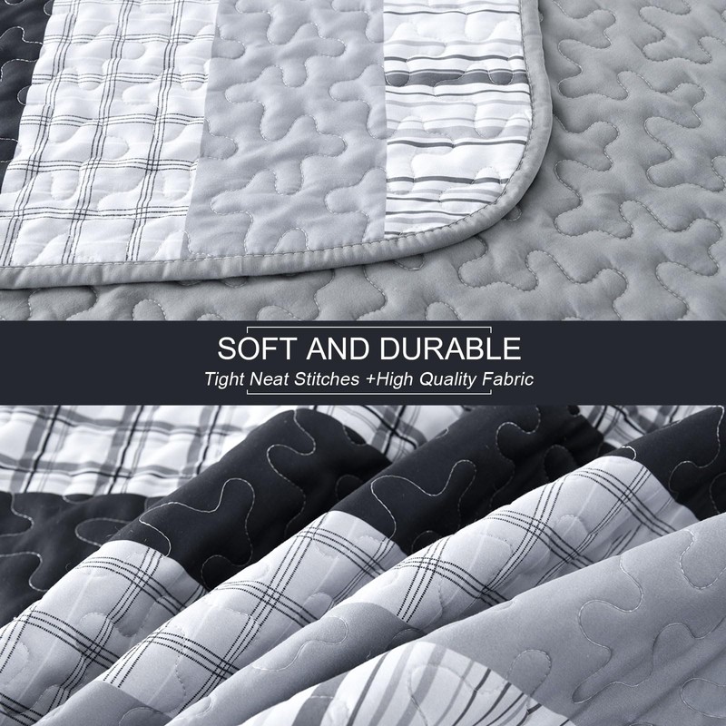 2,Farmhouse coverlet is designed with farmhouse stripe patchwork pattern, simple black and grey lines and patchwork plaid with matching design elements, which can add stylish and minimalist elements to your bedroom.
