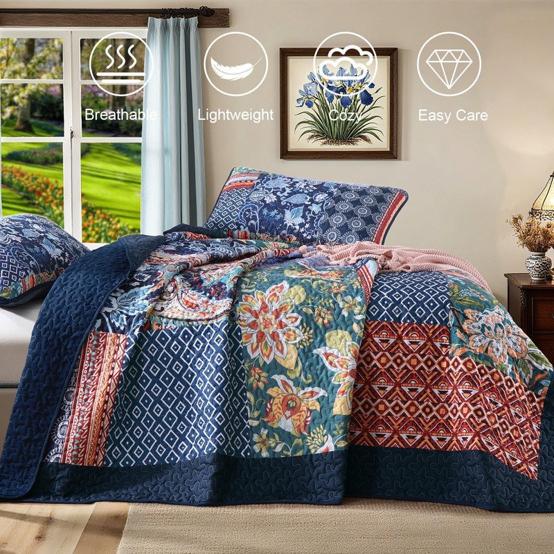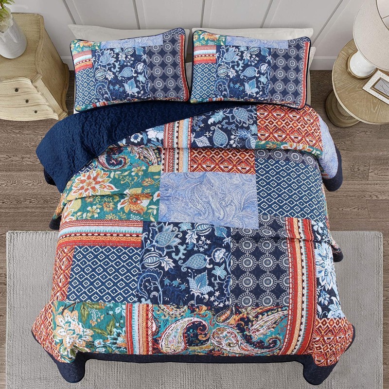 - Bohemian Patchwork Quilt Set: This unique quilt set features a bold patchwork design, combining vibrant Bohemian prints, classic paisley patterns, and vintage floral elements. Each piece is framed with a solid color border, adding both a modern touch and a sense of harmony to the eclectic mix of designs. The reversible side offers a simple, solid-colored option for a more minimalist look, providing versatility in styling.