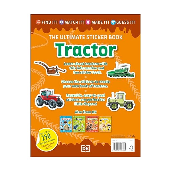 This is the ultimate sticker book for kids who love stickers and tractors. It's filled with big and noisy farm vehicles, trucks and diggers, and over 250 reusable stickers!Kids will love these unusual types of machines, and will love placing the stickers on the different tractors, or even on their own belongings! The stickers are reusable, and easy for little fingers to peel off the pages.Explore the World of TractorsUltimate Sticker Book Tractor is the perfect way to engage your child with fun facts and interactive reading.Inside this exciting little sticker book, you'll find:- Over 250 reusable stickers that are easy to peel and stick to pages or other surfaces- Interesting facts for kids to discover about tractors, trucks, and trailers- Bold photos and illustrations of working vehicles that will captivate and engage childrenThis colourful activity book keeps kids engaged and learning as they play. The eye-catching photos and bright pictures will fascinate little ones and keep them coming back to this educational book. They're challenged to complete the images with the right vehicle parts, and they can also get creative and craft their own scenes out of different stickers. There's no end to where their imagination can take them!Alongside the pictures are bite-sized descriptions and information that is easy to read and suitable for children 5 years and up. They will learn about the different types of farm and construction vehicles, the important jobs they do, and even what power tyres they need. This sticker book inspires little ones to explore the outside world with activities such as follow-the-trail. There's also a quiz so you and your pre-schooler can read and engage together.More from DK Books:If you and your child enjoyed the activities in the Ultimate Sticker Book Tractor, and want to play with some more stickers, there are lots of other things to learn about! Look out for Ultimate Sticker Book Planes and other Flying Machines and Ultimate Sticker Book Things That Go.