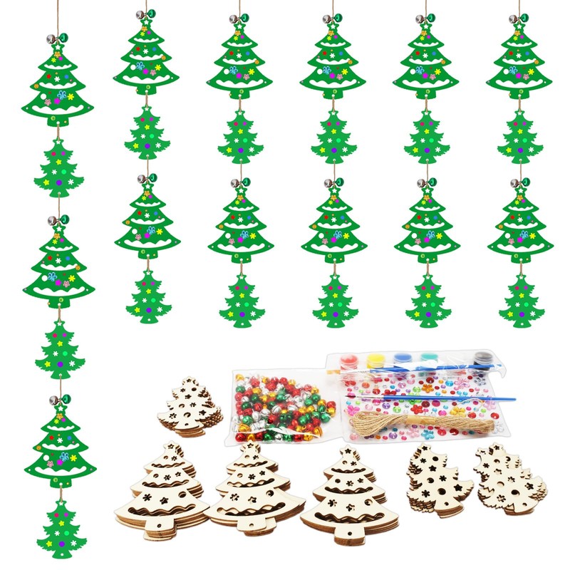 - Christmas tree craft set: Christmas tree decorations hanging set contains 30 x wooden Christmas tree, 100 x bells, 1 x rope (10 m), 6 x paints, 2 x painting brushes and 1 x sticker. The unique Christmas craft set can be decorated anywhere.