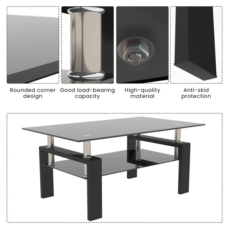 DKLGG Glass Coffee Table, Rectangle Center Table Living Room Tables with Lower Shelf, 2-Tier Modern Black Coffee Table w/Metal Tube Legs, Glass Tables for Living Room Waiting Area, All Black