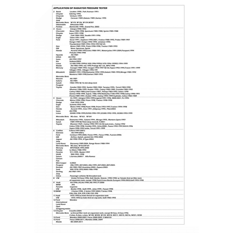 - Comprehensive testing: Our coolant pressure tester kit includes various adapters that enable you to test several types of radiators and cooling systems, you will receive 1 pressure test pump with pressure gauge 1 thermometer 3 chrome plated steel cap adapters 13 radiator cap adapters 1 carrying case