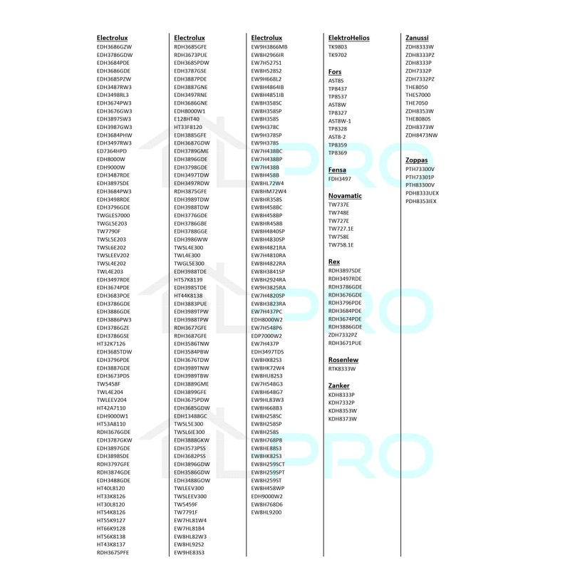 AEG Electrolux ElektroHelios Faure Fensa Fors Husqvarna John Lewis Novamatic Rex Rosenlew Zanker Zanussi Zoppas