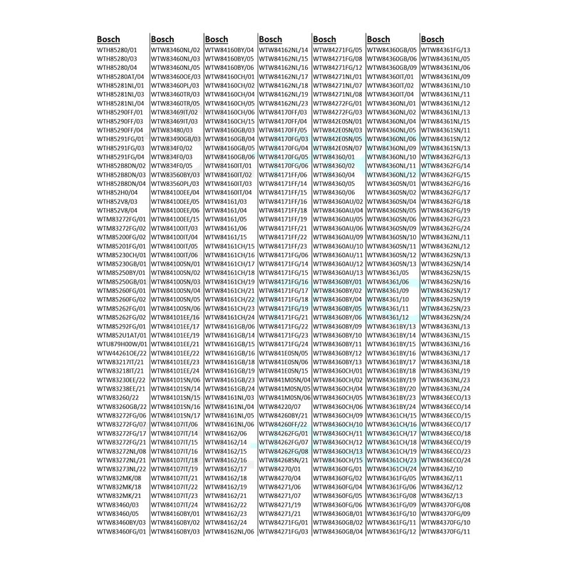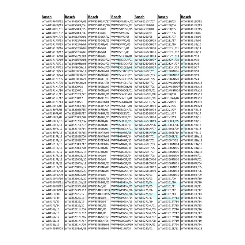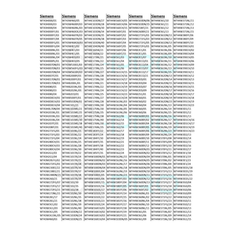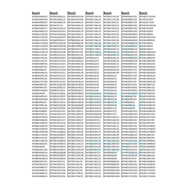 • Fits Bosch models WTB.. WTE.. WTG.. WTH.. WTM.. WTU.. WTU.. WTW.. WTY.. │ For Siemens models WT4.. WT6.. WT7.. I For Balay models 3SB.. 3SC.. I For Constructa models CWK.. I For Pitsos models WTP.. I For Koenic models 1KD.. KDR..