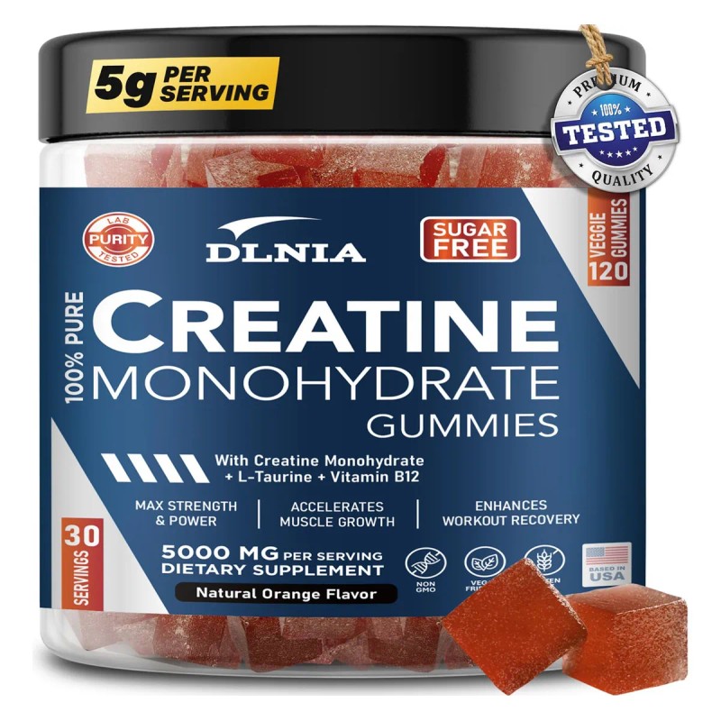 DLNIA- 120 Gomitas de Creatina Monohidrato para Hombres y Mujeres, Apto para Veganos, Sin Azúcar y Sabrosos Masticables