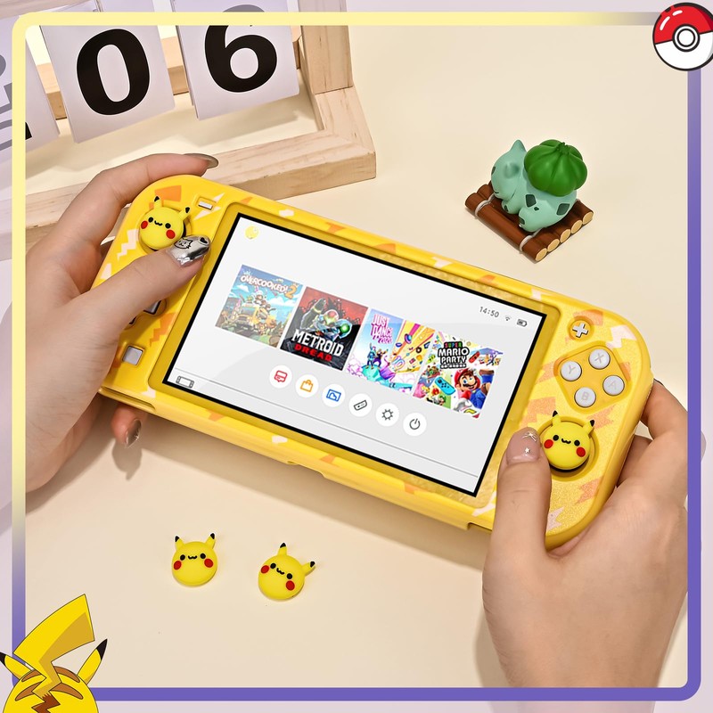 DLseego Flash Pika Switch Lite Protective Case Cool Hard PC Shell Shockproof Scratch Resistant Cover Joy Con Japanese Amine Skin with 2PCS Lovely Cartoon Thumb Grips Caps for Switch 2019 - Yellow 3