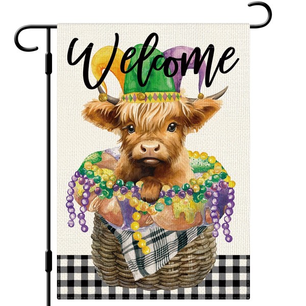 DLZDN Mardi Gras Highland Cow Garden Flag New Orleans Carnival Garden Flag 12×18 Inch Double Sided Vertical Burlap Farmhouse Yard Flag Holiday Outdoor Decor