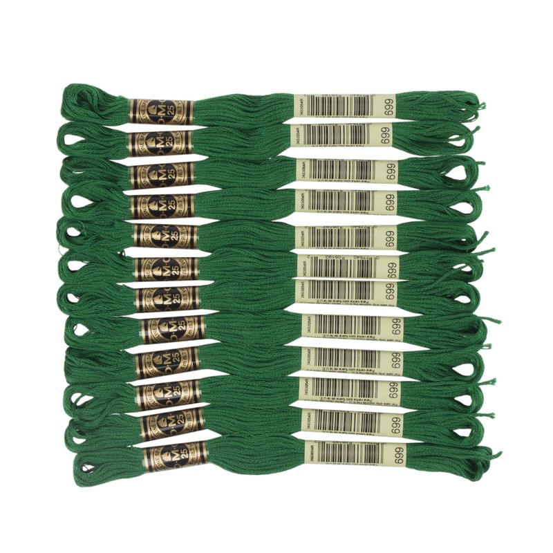 DMC-Six-Strand Embroidery Cotton. A brilliant; six-strand floss made from double mercerized; long staple 100% cotton fibers. The floss is packed twelve 8.7yd/8m skeins per box. Imported.
