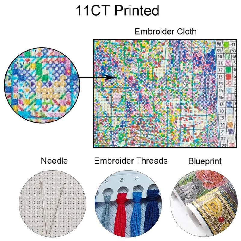 - 【Easy to sew】Pre printed 11CT cross stitch fabric with patterns and symbols for easy stitching, with simple and easy to follow instructions, perfect for beginners in cross stitch. Blunt headed needles will not harm hands. Note: For 11CT cross stitch, please use 3-strand and 2-strand threads for reverse stitching.