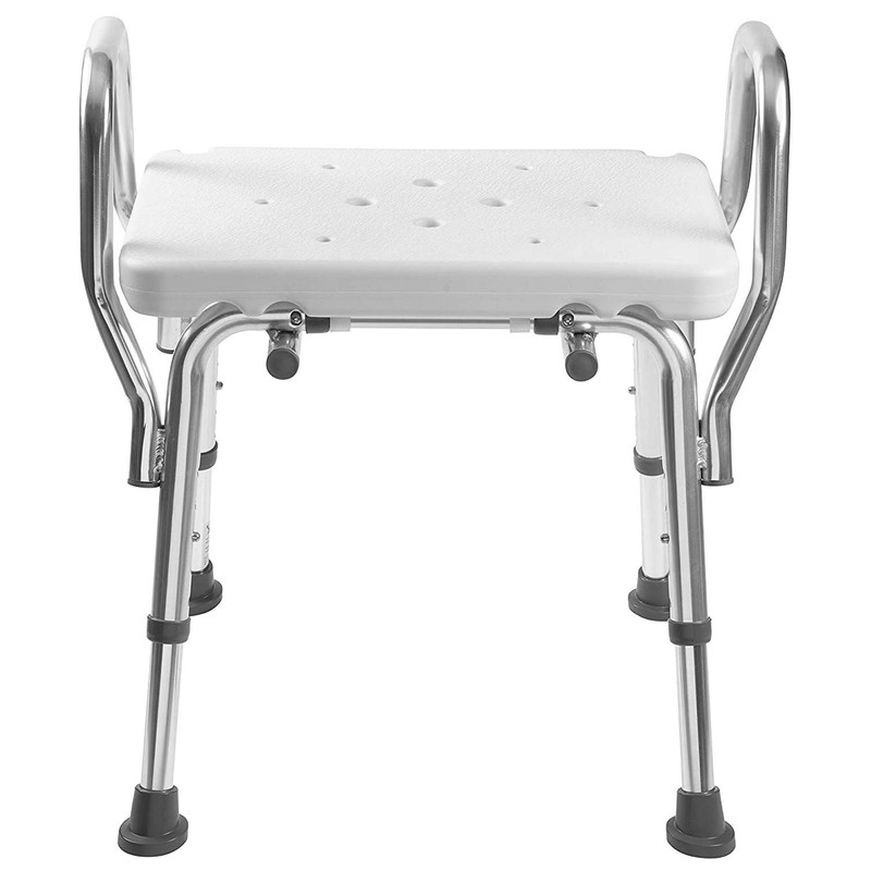 - BATH CHAIR WITH DRAIN HOLES eliminates water build up on the seat to reduce slipping with two arm rests for standing and sitting assistance