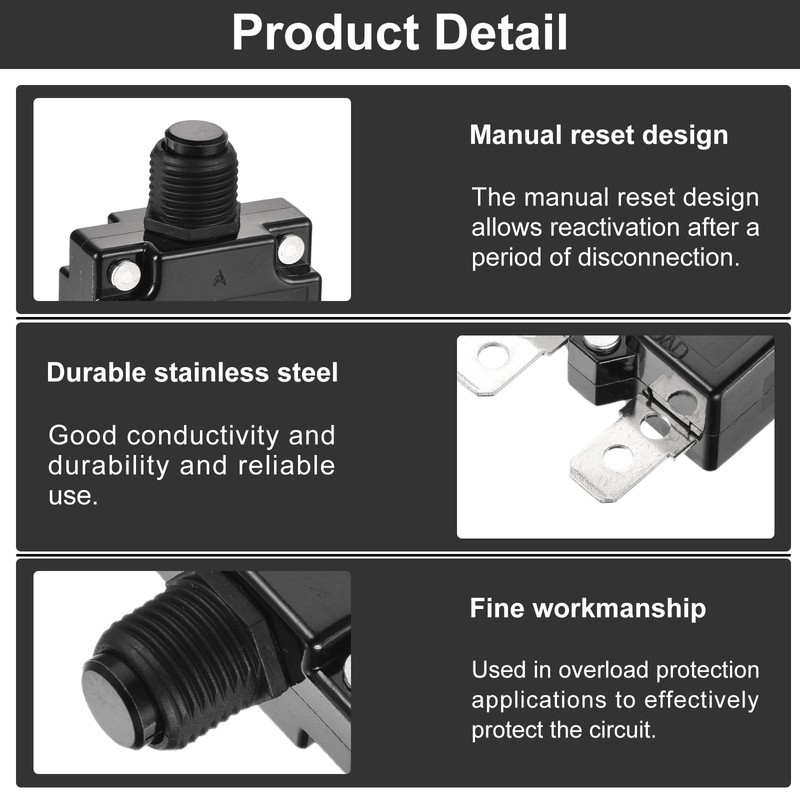 - FUNCTION:Circuit overload protectors can play the role of over current protection and short circuit protection, protecting the power circuit from overheating due to overload. The manual reset design allows feedback after being disconnected for a period of time. The reset button of the switch automatically cuts off the circuit when the load exceeds the rated current, effectively protecting the circuit.