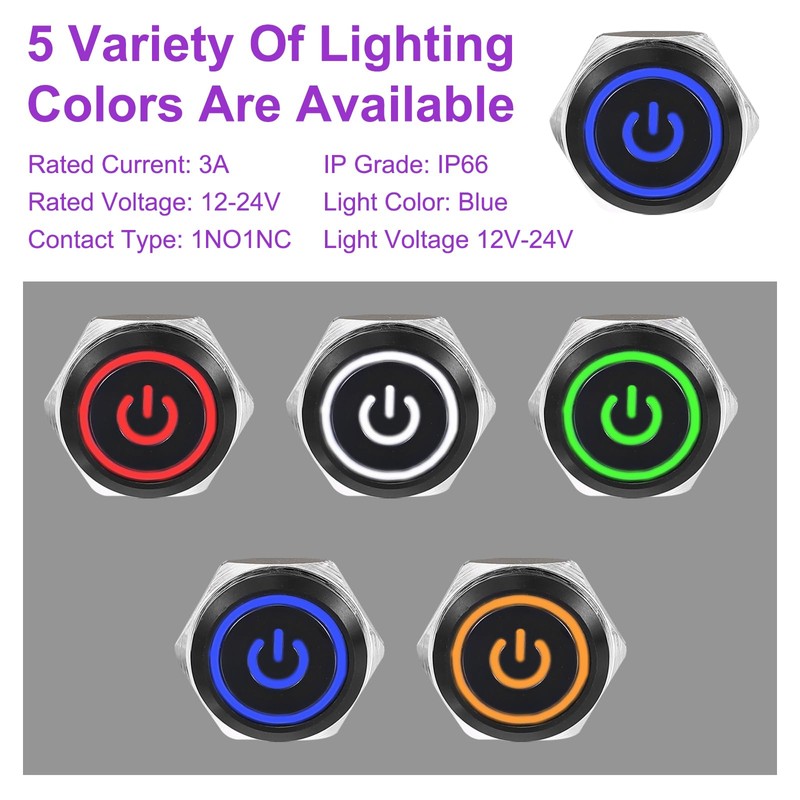 - Product Name: Push Button Switch; Material:Aluminium Alloy; Mounting size: 19mm/ 3/4 Inch; Pin number: 5; The pattern of Light: Switch; Action Type: Momentary; Wiring methods:With 15cm/6 Inch pre-soldered wire; Rated Current: 3A; Rated Voltage: 12-24V Contact Type: 1NO1NC; Button Shape: Flat Head Button Color: Black; Light Color:Blue IP Grade: IP66; Package Content: 2 x Push Button Switch