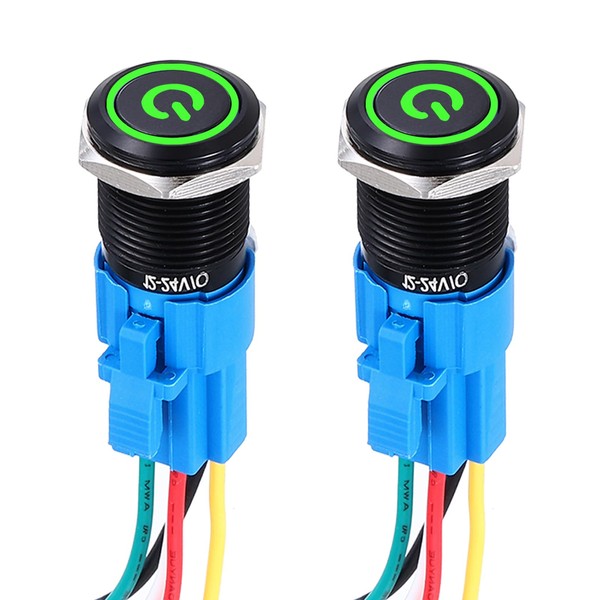 - Product Name: Push Button Switch; Material:Aluminium Alloy; Mounting size: 19mm/ 3/4 Inch; Pin number: 5; The pattern of Light: Switch; Action Type: Momentary; Wiring methods:With 15cm/6 Inch pre-soldered wire; Rated Current: 3A; Rated Voltage: 12-24V Contact Type: 1NO1NC; Button Shape: Flat Head Button Color: Black; Light Color:Green IP Grade: IP66; Package Content: 2 x Push Button Switch